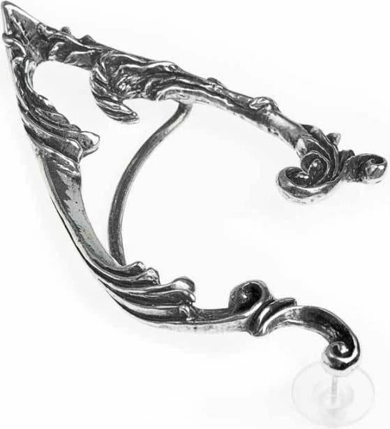 A polished, antiqued pewter pointed elf-ear-shaped ear-wrap fashioned from decorative, floral scroll work and neatly framing the ear – can be gently squeezed to comfortably fit your own ear; fastened at the lobe with one surgical steel ear-post.