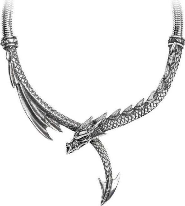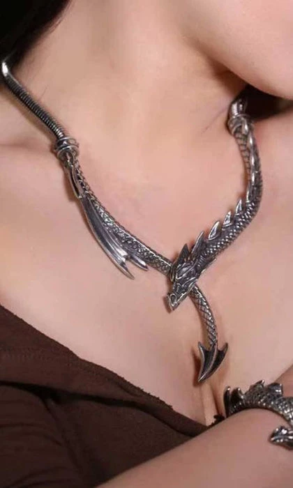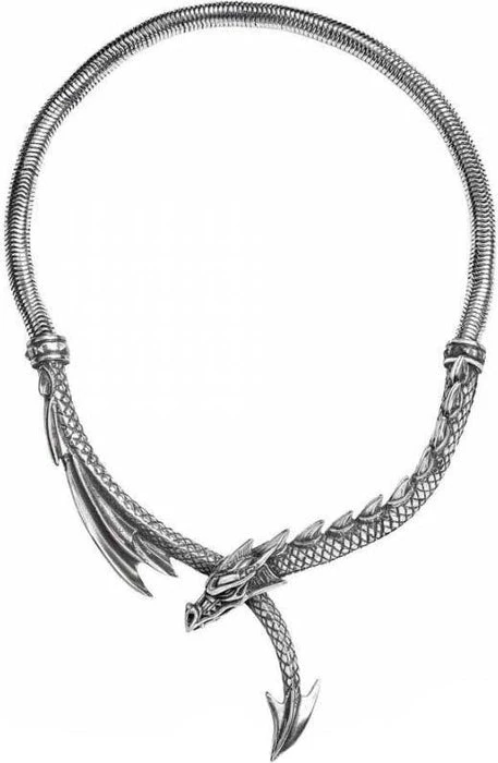 A large solid pewter, antiqued and polished necklace of a spined dragon wrapping around the neck, on a continuous snake chain with its head overlapping the tail and fastened by a magnetic catch under its head.