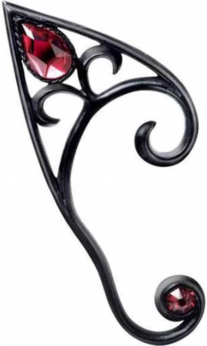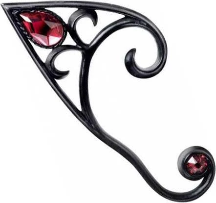 A pointed elf-ear-shaped ear-wrap in polished, black pewter of delicate scrollwork neatly framing the ear and set with two large, red Swarovski – can be gently squeezed to comfortably fit your own ear; fastened at the lobe with one surgical steel ear-post.