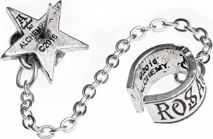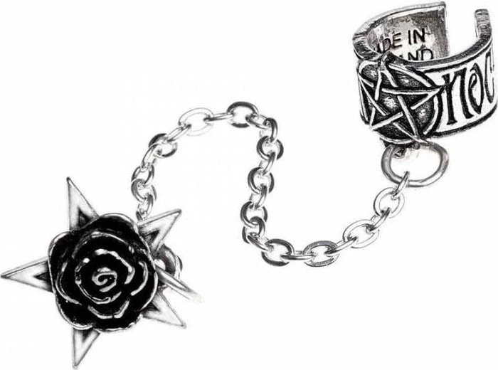 An eponymous pewter band cuff with pentagram, for the upper ear, chained to a pentagram and black rose stud with surgical steel ear-post.