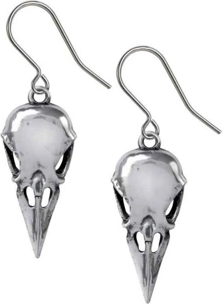 A raven skull in a bright polished pewter finish on surgical steel ear-wires.