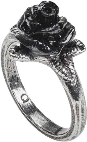 A delicate pewter ring of rose leaves set with a small black resin flower head.
