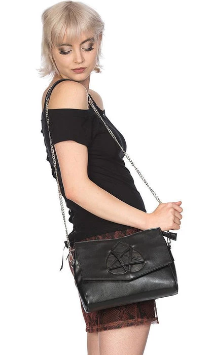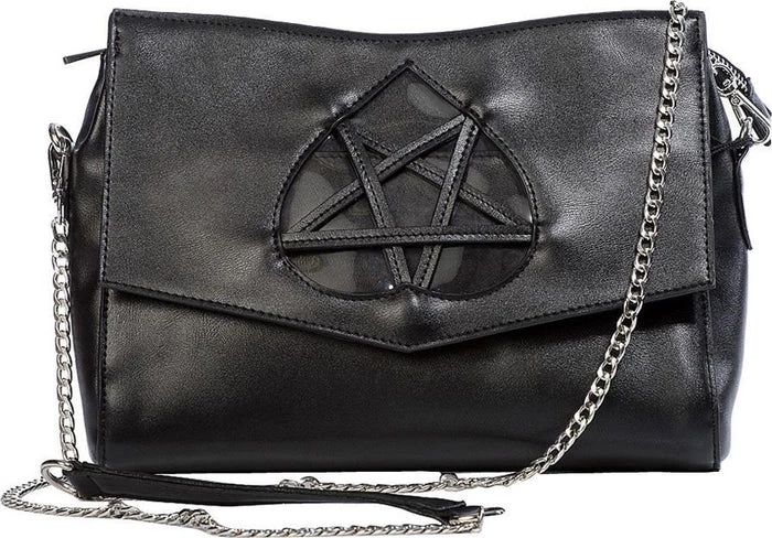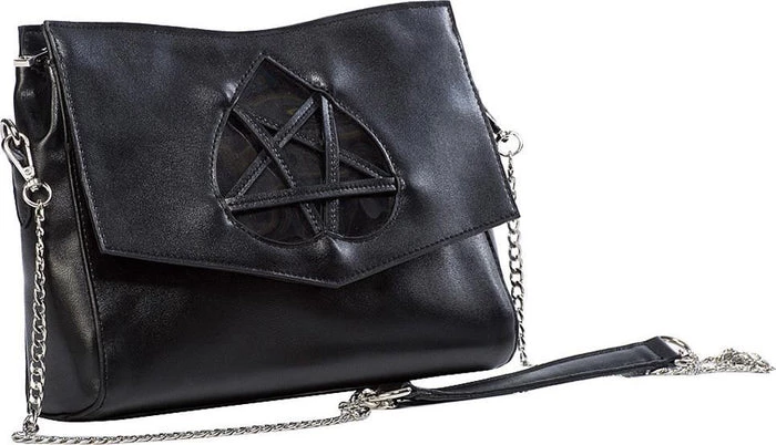 Day night or both; how will you wear yours? This glamorous Gothic handbag come with silver tone chain strap and chain detail. An upturned heart and pentagram detail adorn the front flap.Β