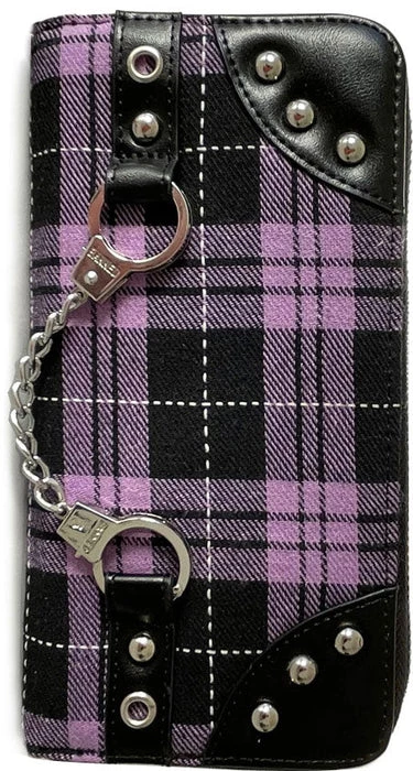 Lock up your finances! This punk inspired wallet is finished in red tartan, with a metal handcuff charm and studwork.