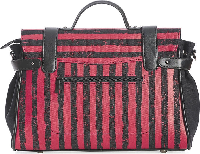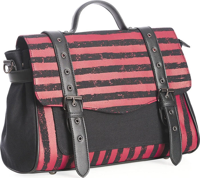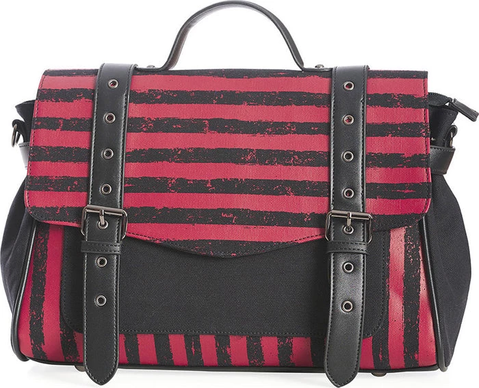 This black andย red cigarette-style, striped grungyย messengerย bag is perfect for anyone and super roomy for all your bits and pieces! Featuringย faux leather eyelet straps and black accents this bag is totally punk. Pair this bag with the Spooky Nightwalks pants,ย knee-high boots and a black t-shirt for a punk casual aesthetic!