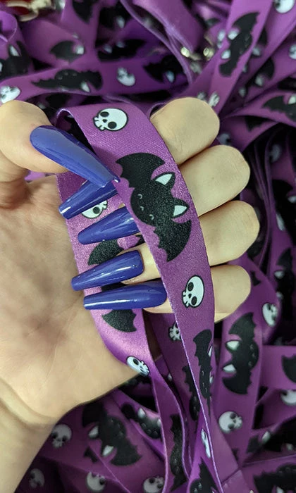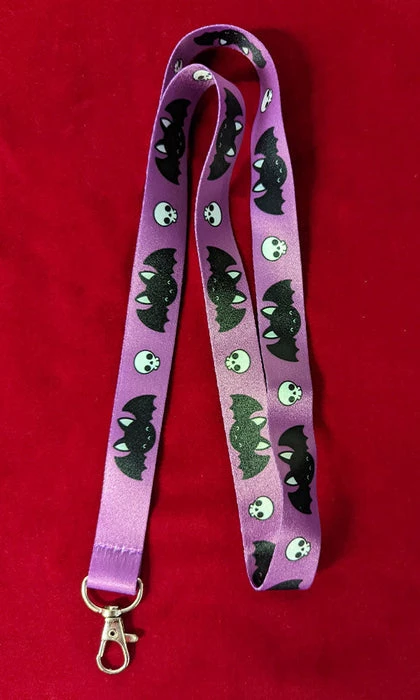 This Purple, Black and White Lanyard features our beloved bat friend, Koumori-Chan and some cute mini skulls! The hook allows you to attach most styles of Card, ID holders or keys.