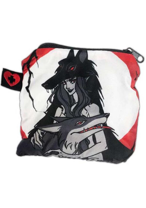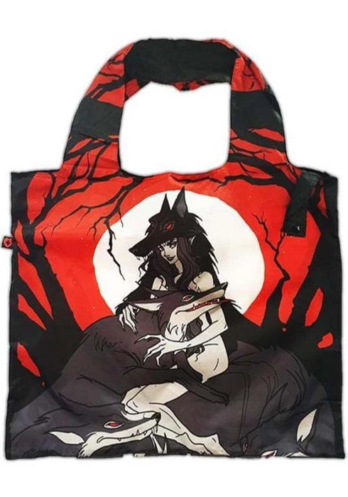This fierce tote bag features a wild wolf girl and her protective pack.
