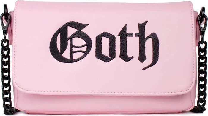 “Goth” embroidered text on faux leather crossbody with matte black finish hardware and premium quality chain. Removable crossbody strap allows to be carried as a clutch. Custom interior