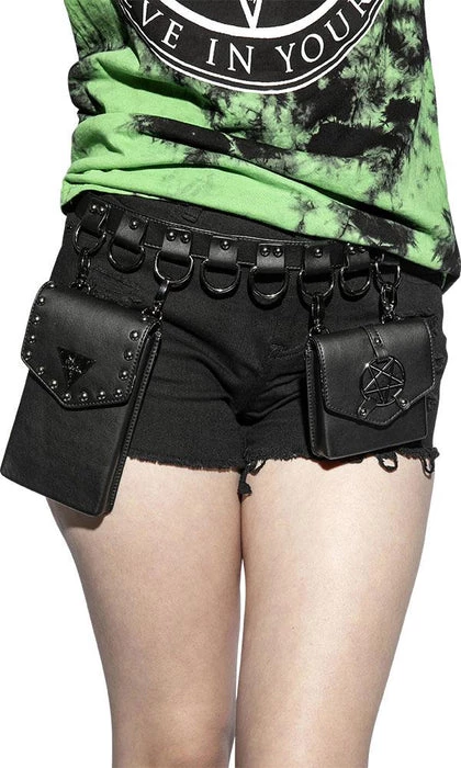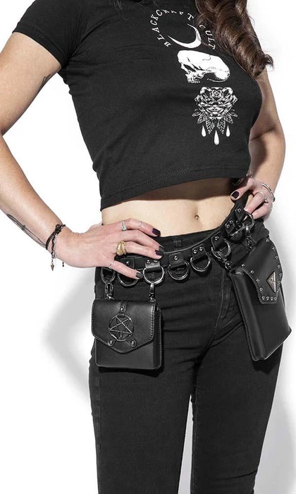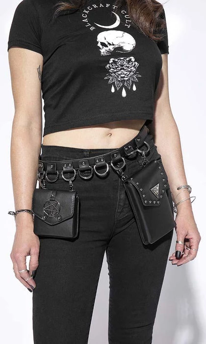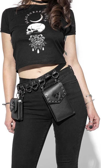 Faux leather multi belt bag features two adjustable/removable small faux leather goods. One is sized perfectly for a phone and the other for smaller items such as cards/ID. Features gunmetal finish Blackcraft logo hardware and studs. Additional D-rings on belt to attach your own accessories.Β