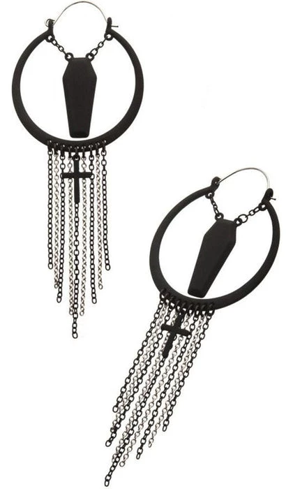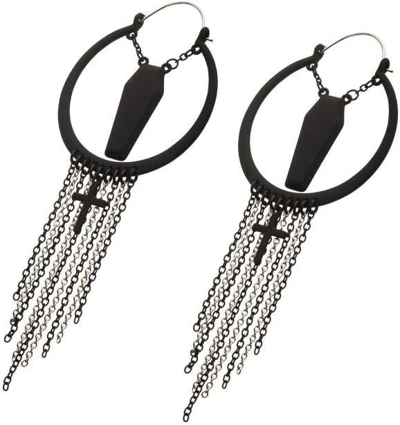 Black Plated Cut Out Coffin with Chains & Cross Plug Hoops.