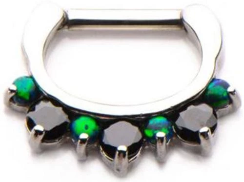 This Enchanted Forest Septum Clicker features Black Cubic Zirconia Gems and Green Synthetic Opals!Β Perfect for your Septum, Helix, Daith, or Conch piercings.