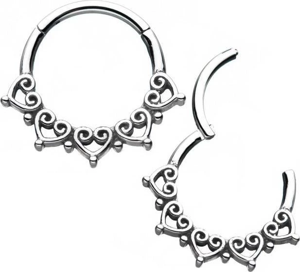 Surgical Steel Heart Hinged Segment Rings. Sold individually. The hinge on this specific design allows the wearer to never lose a small segment piece again and it has that easy snap seamless fit. Perfect for Helix, Septum and Cartilage.