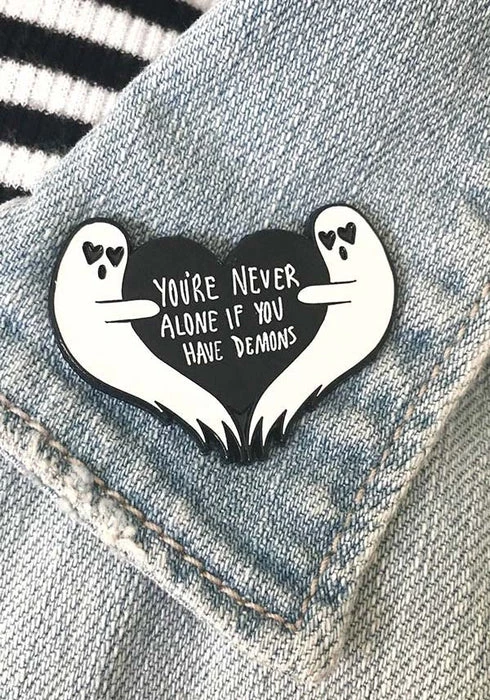 This pinΒ features two lovestruck ghosts holding a black heart with the quote, βYouβre never alone if you have demonsβ.
