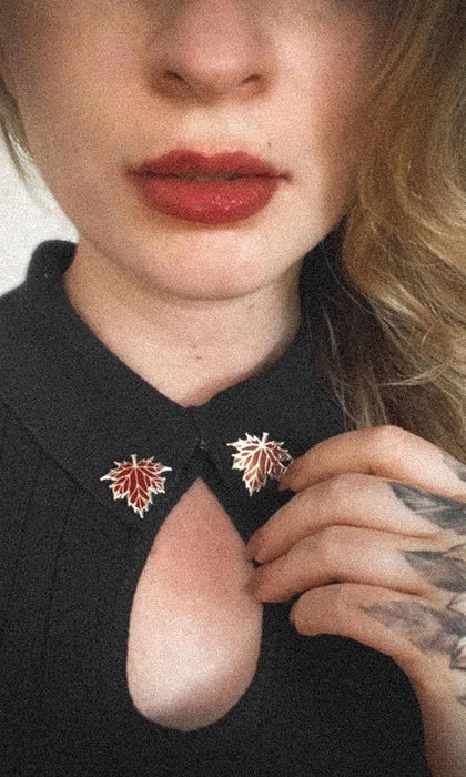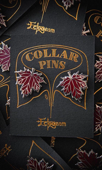 Exude the energy of a crumbling gothic mansion drenched in magic and sat upon a mote ofΒ fallen, oxblood leaves. Ideal for Autumn fashion, this elegant collar pin set features a pair of silverΒ and red autumn leaves. Ideal for witchy style and dark academia aesthetics.Β