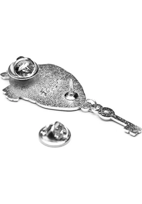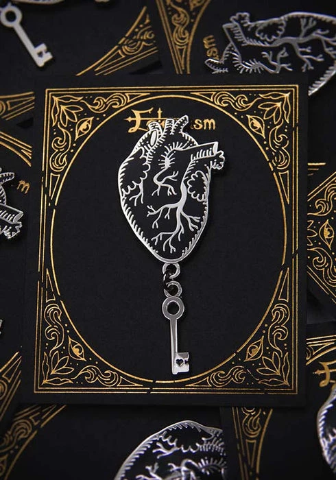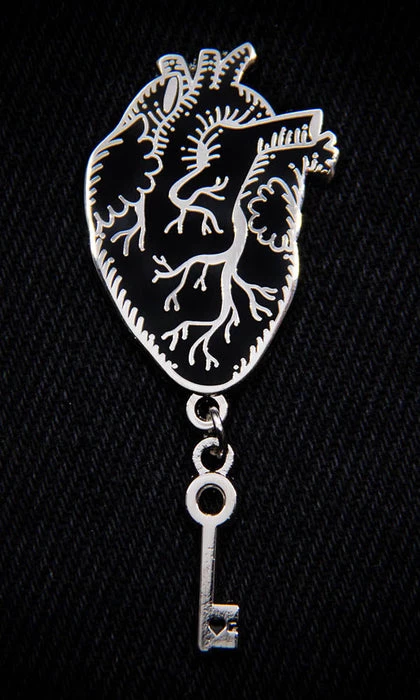 This vintage medical illustration inspired enamel pin features an anatomical heart with a hanging key charm. Made with silver metal and black enamel, it makes a spooky accessory to pin on your jacket.