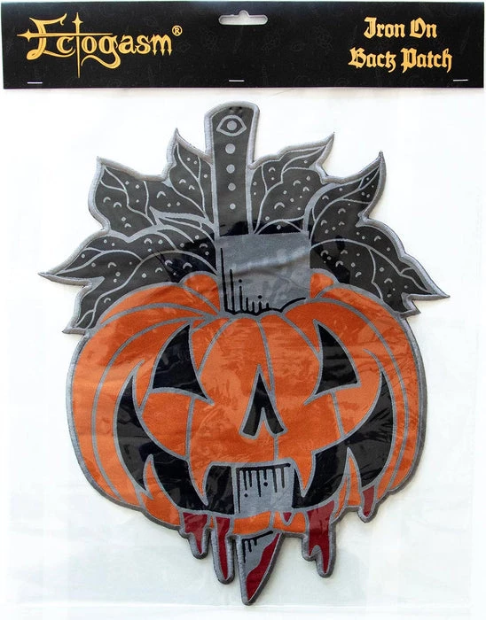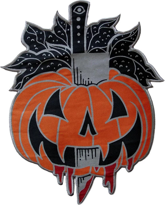 – Features a scary jack-o-lantern that’s been stabbed through with a carving knife.