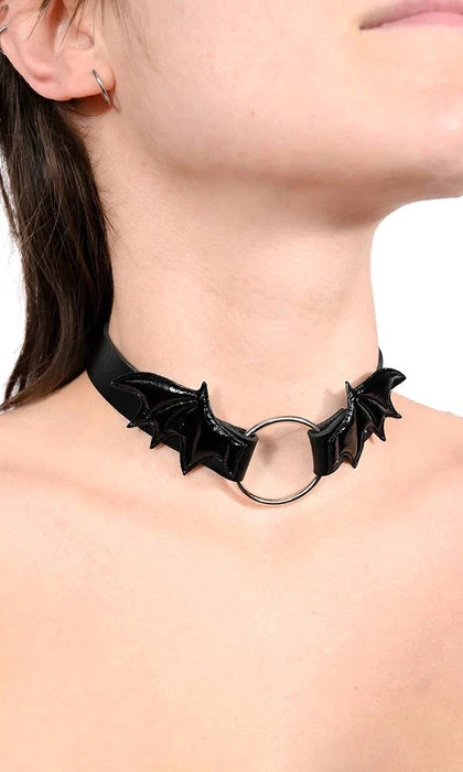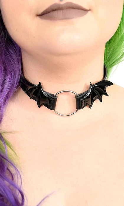 This black faux leather choker is the perfect addition to any spooky outfit! Features front o-ring, bat wings andΒ 3 back snaps.