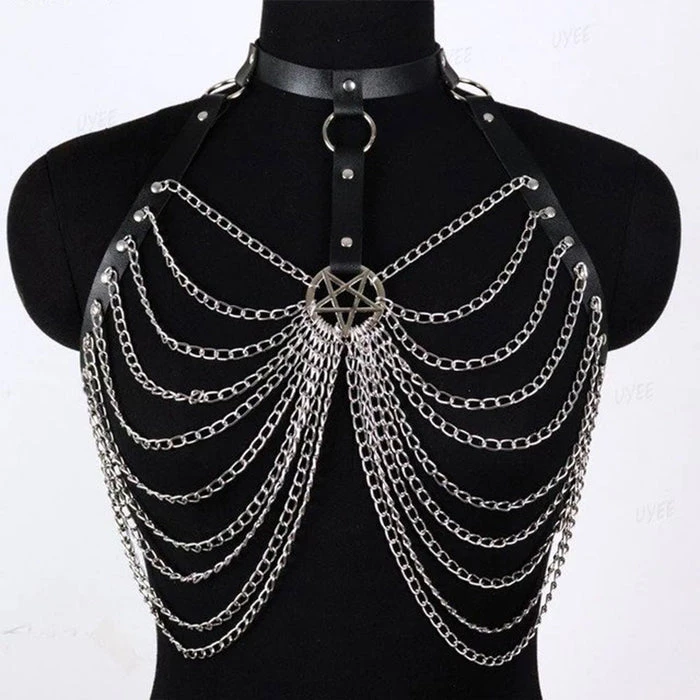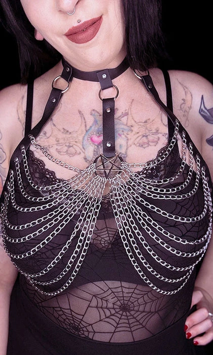 Be my Beelzebabe? ~ Don the Beelzebub harness and feel like the sexy demon you are! Featuring a Pentagram charm, chains and O-rings this harness is perfect for accessorisingย and styling your favourite outfits to the next level!ย