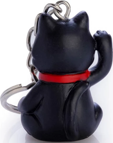 This mystical keychain is shaped like a lucky black cat. It features vibrant green eyes, a golden bell and pentacle design on a traditional keychain ring.