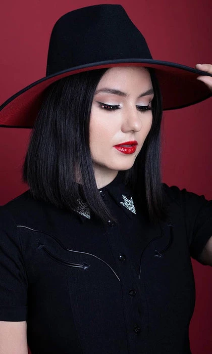 This classic piece is sure to be an inviting addition to any wardrobe. The Dracula hat possesses a deep black exterior, paired with the contrasting blood-red brim, and is aptly named after one of the most iconic figures in Gothic literature. No wonder it’s one of Katakomb’s most seductive pieces to date!Β