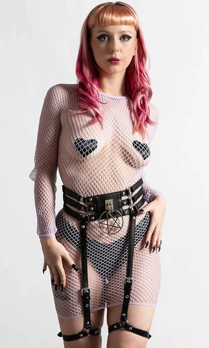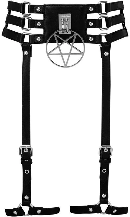 Never be too busy to accessorise. With the ‘Baby Hex’ suspender belt, you can add instant drama to your favourite outfits – turnin’ them from just alright to Queen of the Night. High-quality faux leather with triple strap high-waist, statement hardware with pentagram and loaded with D-rings and adjustable straps. Hell-to-the-Yeah!