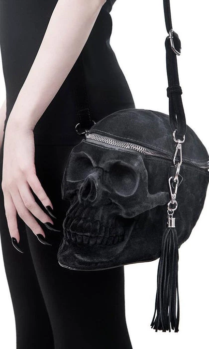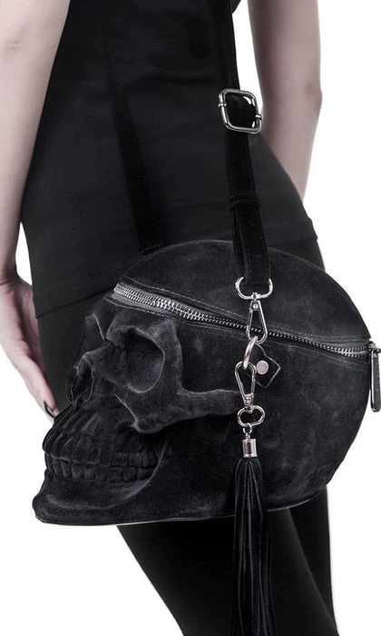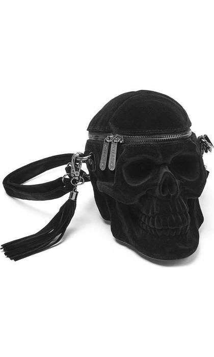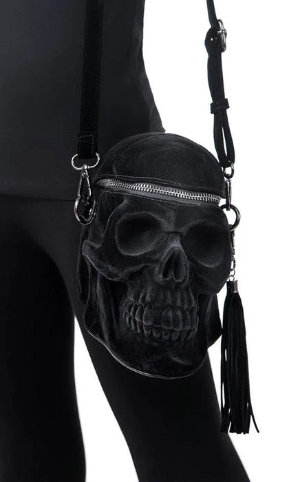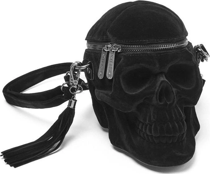 Welcome our newest skull member, in lush velvet coating!Β The ‘Grave Digger’ handbag is your creepy must-have – large human skull handbag – with intricate detailing, zip opening, long shoulder strap and detachable tassel detail.Β All Hail the Halloween Queen!