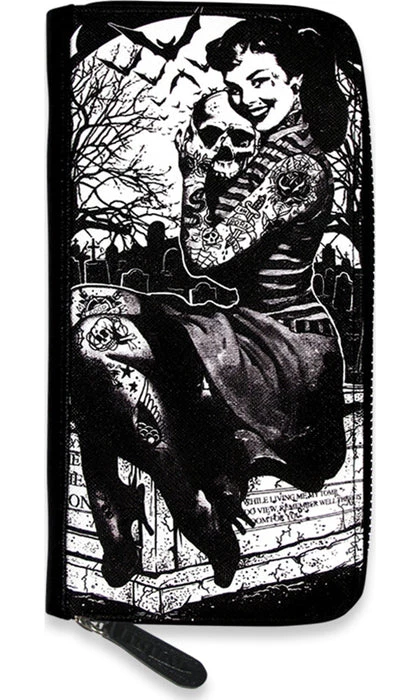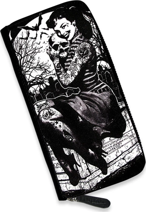 A stunning black and white printed wallet that has plenty of places to store cash, cards and I.D, coins and more. With a metal zipper closure to secure all your belongings, it is the perfect accessory for your goth outfit!