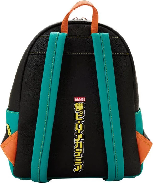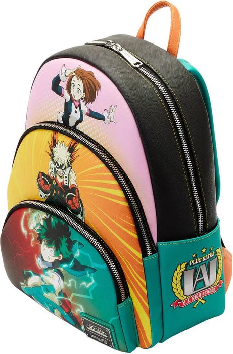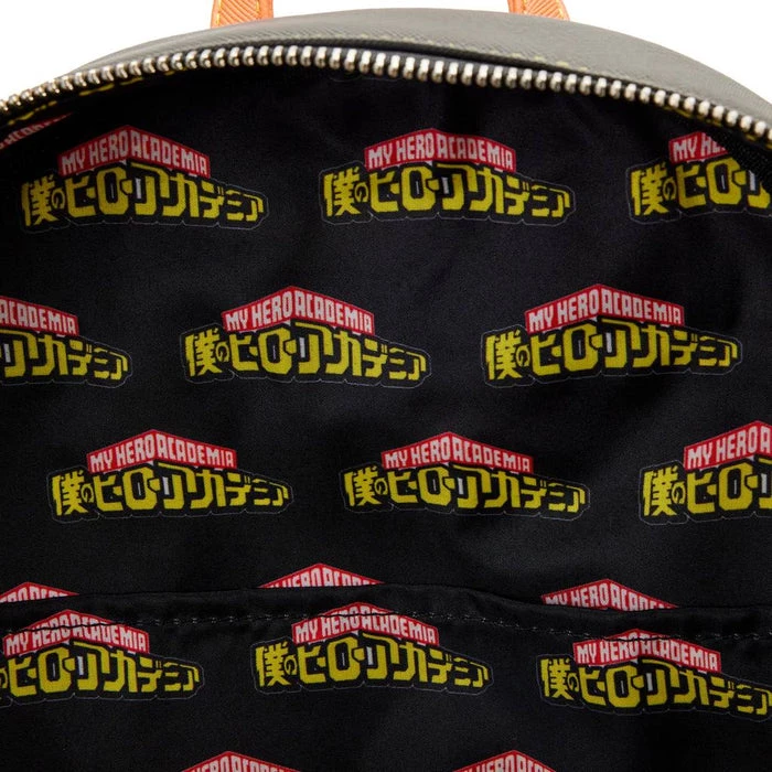 Smash it! Carry this Loungefly My Hero Academia Triple Pocket Scene Mini Backpack to win the day. Whether youβre heading off to hero training or just packing a few things to power through, this backpack allows you to never give up and to go Plus Ultra! On the front, youβll find three pockets with three different scenes. At the top, Ochaco Uraraka appears against a pink and gold dotted background. Next, youβll find Katsuki Bakugo, ready for action, against a brilliant orange and yellow background. On the third pocket, youβll find Deku (Izuku Midoriya), coming to life in electrifying detail.