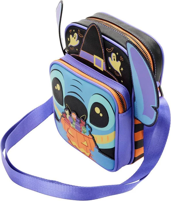 This trickster is ready for a sweet treat! Unwrap some festive fun with the Loungefly Lilo and StitchΒ Glow Halloween Candy Cosplay Passport Bag. On the front zipper pocket, Stitch grins down at a pumpkin-shaped basket filled with treats. Up above, a witch hat sits between his ears. Turn down the lights to see the spooky, glow-in-the-dark details come to life! On the back of the bag, Stitch says the phrase βGimme candy!β while visiting some friendly haunts. This confectionary crossbody bag will add extra flavor to any outfit and has plenty of room for storing your tricks and treats. This bag is an officially licensed Disney product.