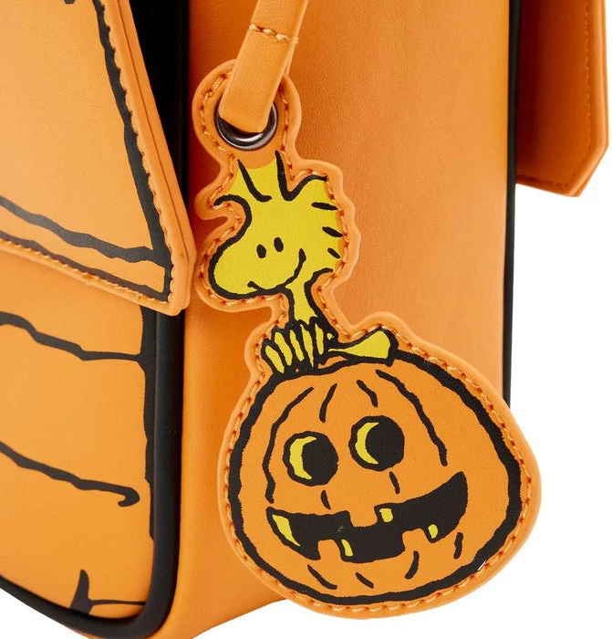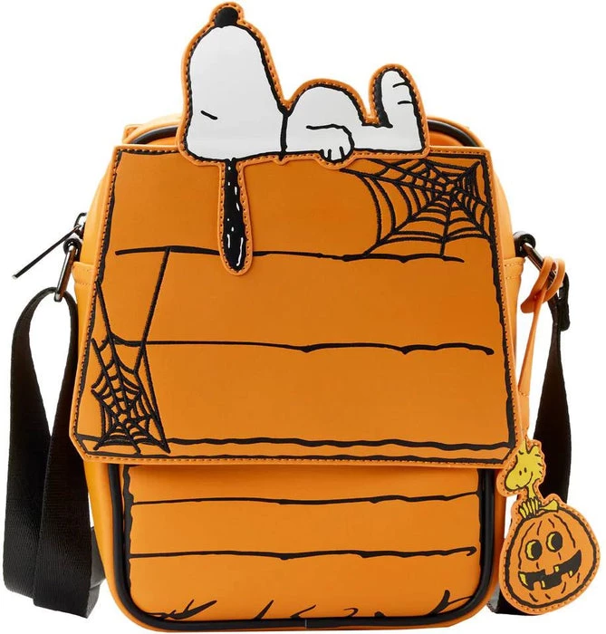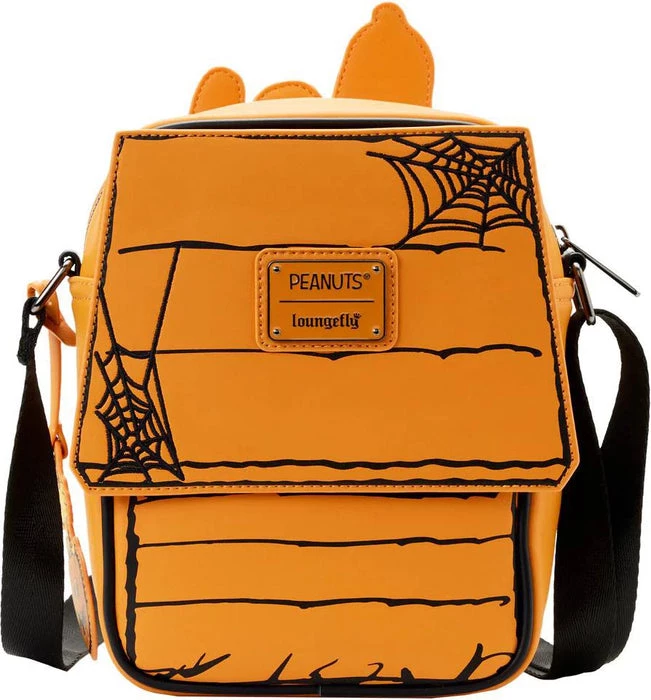Raise the roof for this Loungefly Peanuts Great Pumpkin Snoopy Doghouse Crossbody Bag! Itβs full of delightful surprises. This figural crossbody bag, in the shape of a doghouse, features Snoopy, brought to life in applique detail at the top. While Snoopy rests, he might be dreaming of spooky adventures. Embroidered spider webs and a faux leather zipper charm of Woodstock on top of a jack-oβ-lantern complete the look. Magnetic closures allow you to lift the flap of the roof to find Snoopy with a group of ghosts, shouting Boo! Fantastically frightful bats cover the underside, and thereβs a drop pocket under the flap as well. Itβs the perfect accessory for packing away treats while waiting for the Great Pumpkin to appearβor for turning everyday outings into imaginative adventures. This bag is an officially licensed Peanuts product.
