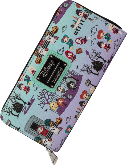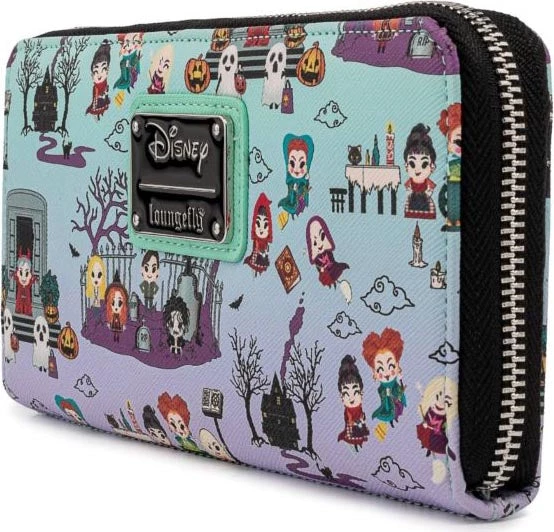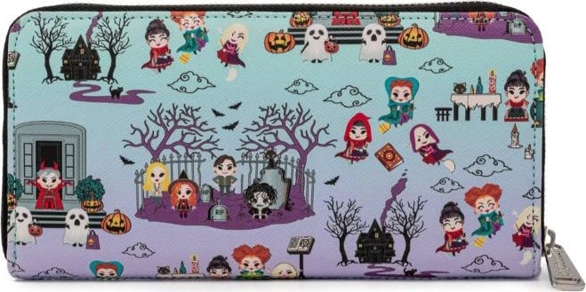 Throughout the all-over print of this wallet, youβll find various characters from the film, including Winifred, Mary and Sarah themselves riding their broomsticks and surrounding a cauldron. Also featured against the pastel gradient are trick or treaters and a graveyard where Billy Butcherson is rising from the dead! Youβll also find various film references scattered throughout the scenes.