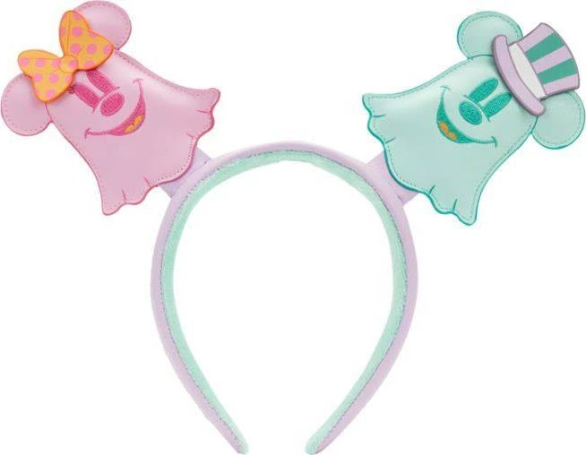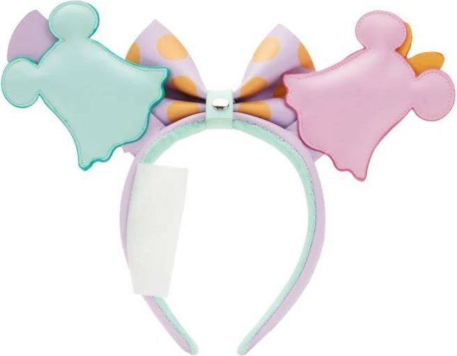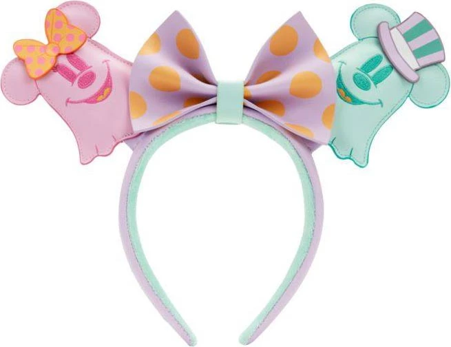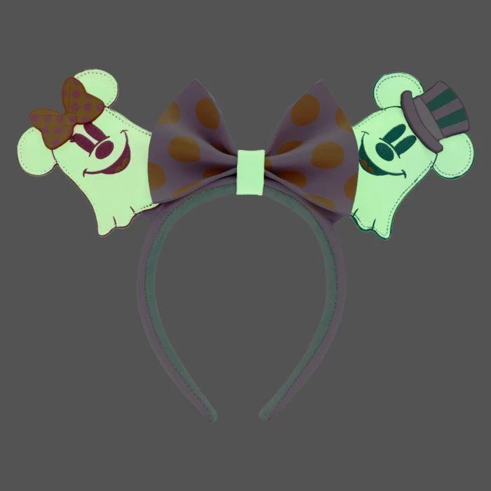 Mickey and Minnie Mouse take the form of the mice ears of this headband! One ear is Minnie as a pink ghost complete with her signature hair bow, while Mickey takes the other ear as an eerie green ghost in an adorable top hat. Their spooky bodies even glow in the dark! A purple and orange polka-dot bow between them completes the look, making this headband the perfect accessory for fans to add some eerie Disney flair to any outfit!