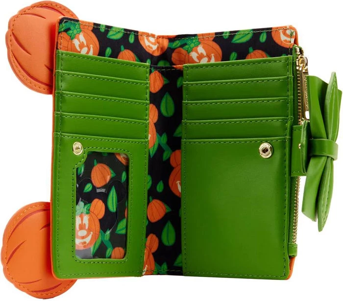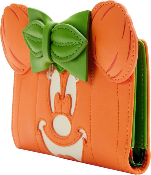 What a treat! Have a scary good fright with the Loungefly Disney Glow Face Minnie Pumpkin Flap Wallet! When the lights go out, Minnie’s mouth, eyes, and nose glow! Green trim for Minnie’s bow adds a fresh complementary colour to the jack-o’-lantern orange face and ears, brought to life with applique and embroidered details. On the inside of this wallet, there are 4 slots on either side for holding cards and 1 clear slot for holding your ID. It’s the perfect accessory for keeping your valuables safe during your Halloween adventures—or for adding wonderfully wicked mischief when visiting all your regular haunts.