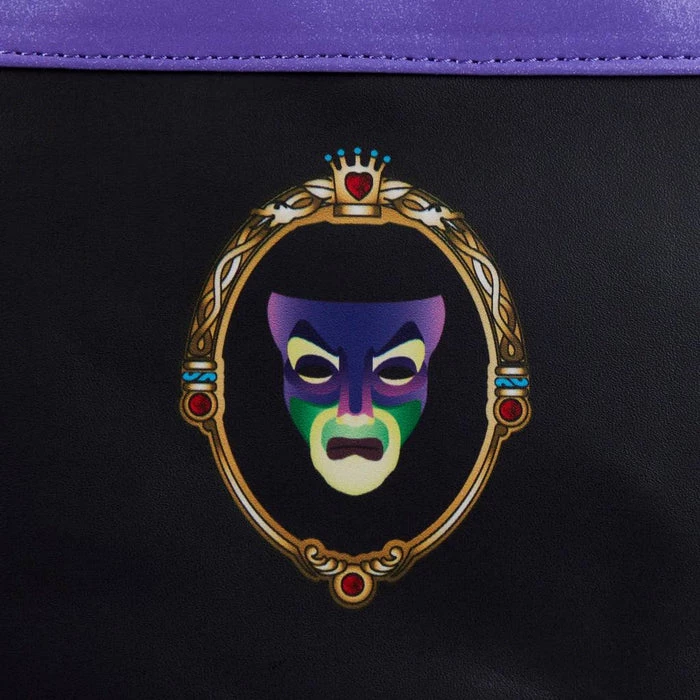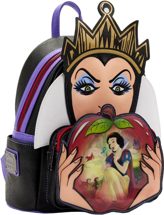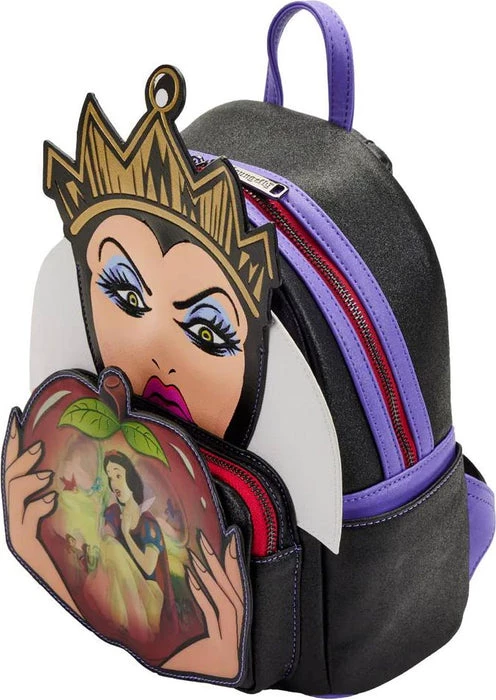 Take a bite! The Evil Queen reveals a deliciously dark plan on this Loungefly Disney VillainsΒ Evil Queen with Apple Mini Backpack. The shiny apple, in the hands of the Evil Queen, almost becomes a crystal ball that reveals, two different scenes: A happy Snow White who sings in the company of birds and poison that drips down in the form of a skull. The Evil Queenβs face comes to life in applique detail, and the shiny apple holds a zippered compartment. This backpack also sparkles with a wonderfully wicked black and purple glitter. The adjustable straps continue the scene with a motif of the poison dripping down the shiny apple. On the back, the Magic Mirror makes a spooky appearance. Celebrate your dark side and carry this backpack with pride. Itβs the perfect accessory to any Disney outfit or for transforming everyday outings into magical adventures.
