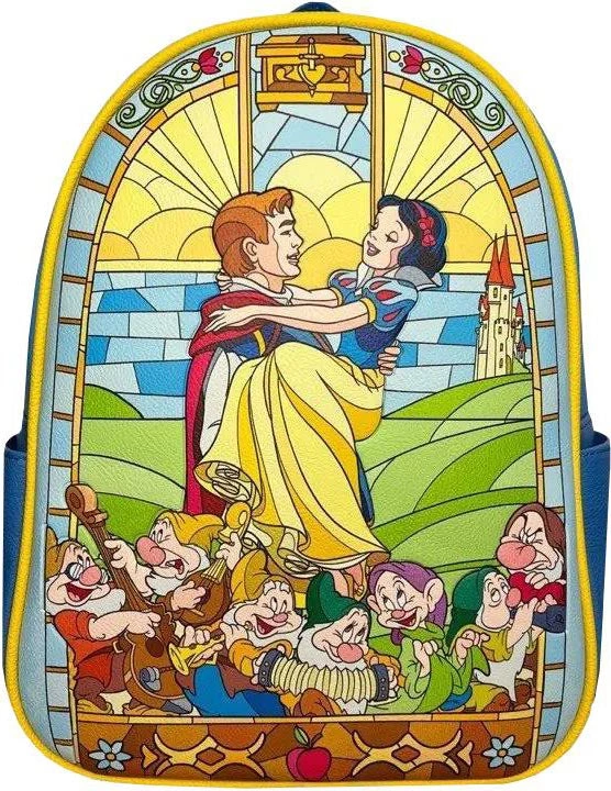 This enchanting backpack shows Snow White in the princeβs arms as they gaze lovingly at one another amidst rolling hills bathed in gorgeous sunlight. Theyβre surrounded by the seven dwarfs gleefully celebrating her awakening along with various motifs inspired by key moments in the film, from the poisoned apple to the box in which the Queen intended to store Snow Whiteβs heart. The scene is complete with blue vegan-friendly leather and yellow piping, perfectly complimenting the vibrance and sheer beauty of the stained glass art style.