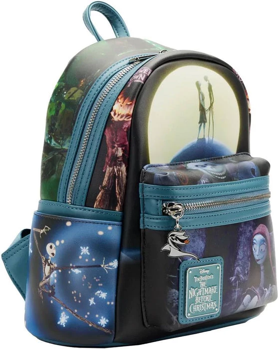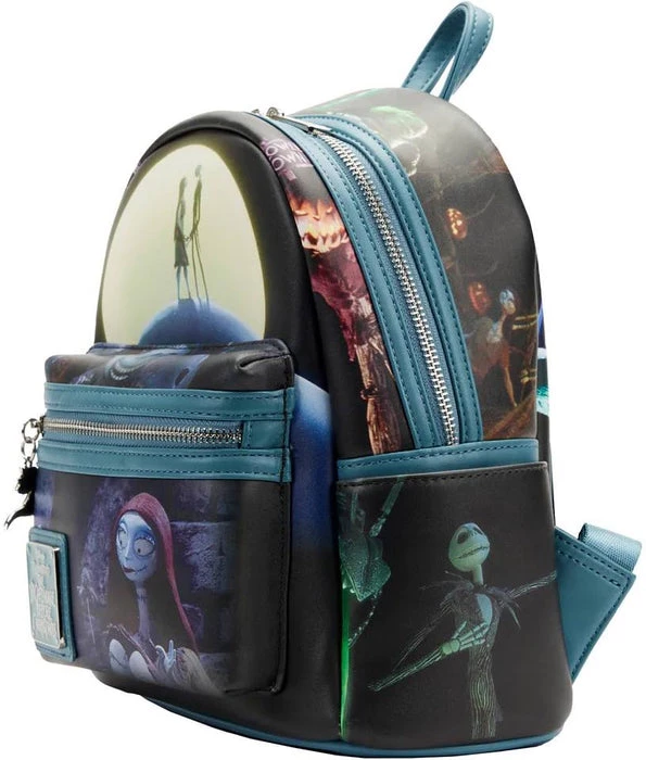 This wistfully romantic accessory is simply meant to be! The Loungefly Nightmare Before Christmas Final Frame Mini Backpack brings to life iconic images from Tim Burtonβs The Nightmare Before Christmas. On the front zipper pocket, Sally leans against a stone wall as she ponders her love of Jack. An enamel zipper charm of Zero the ghost dog accompanies the scene. Up above, Jack and Sally hold hands on Spiral Hill under a full moon. Turn the bag around to find Jack Skellington striking a pose on the bagβs side panels and pockets, while Oogie Boogie appears with a menacing grin on the bagβs back. This mini backpack adds frightful fun to any outfit and is the perfect accessory for fans looking to keep one of their favourite animated movies close.