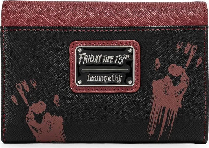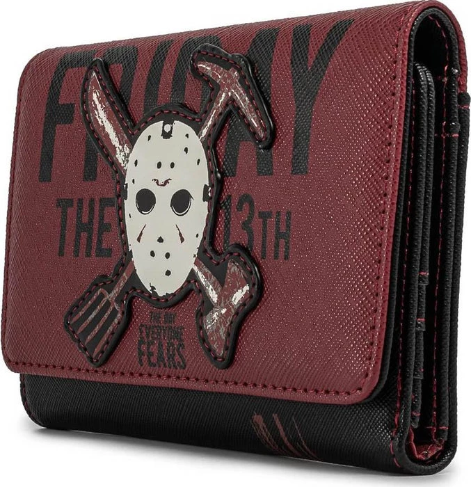 No need to wait for Friday the 13th! The Loungefly Friday the 13th Jason Mask Tri-Fold Wallet is here to put the fear in your collection. On the front a center is Jason’s hockey mask (glows in the dark) which is framed by a pick axe, machete, pitch fork, and axe. It’s a striking design making it an appealing accessory for Halloween-themed outfits.