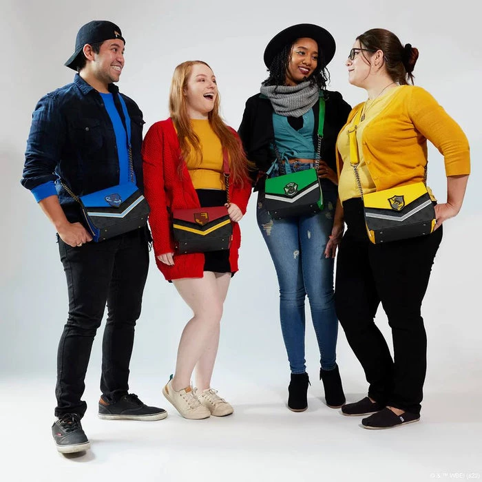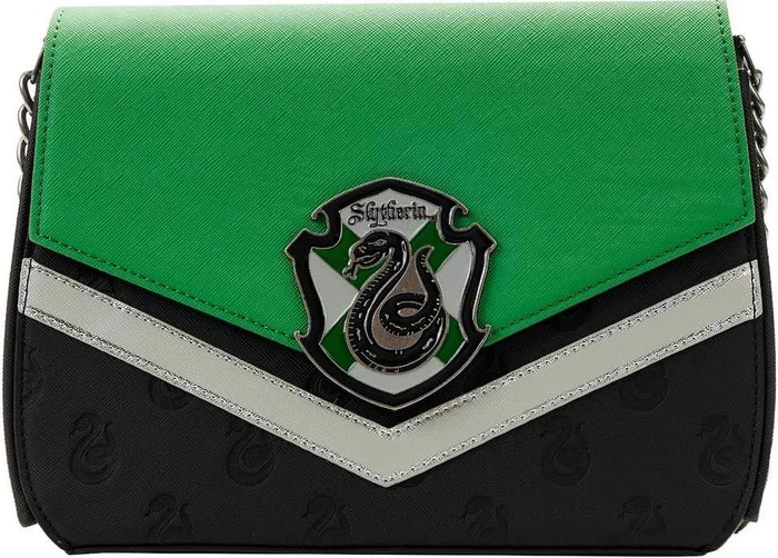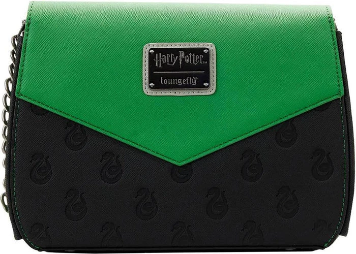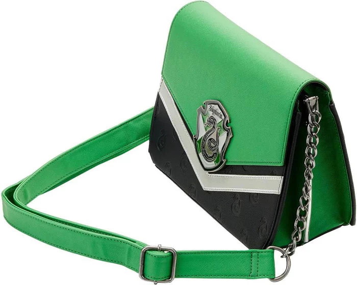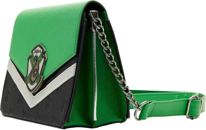 Scale the class ranks at Hogwarts School of Witchcraft and Wizardry in spellbinding style with this Loungefly Harry Potter Slytherin Chain Strap Crossbody Bag. This bewitching crossbody bag incorporates the green and silver Slytherin House colors in a chevron pattern. The Slytherin crest is on a metal rivet, and the snake logo appears again as a debossed all-over-print on top of a black base. The accordion-style sides reveal accents of strands of silver, and a silver chain strap tops off the look. Itโs the perfect accessory for attending a potions class or Quidditch matchโor for turning everyday outings into enchanting moments!