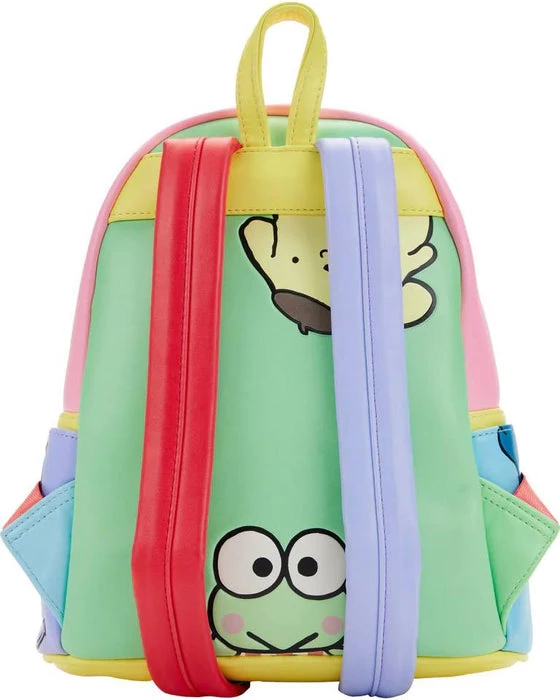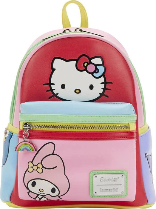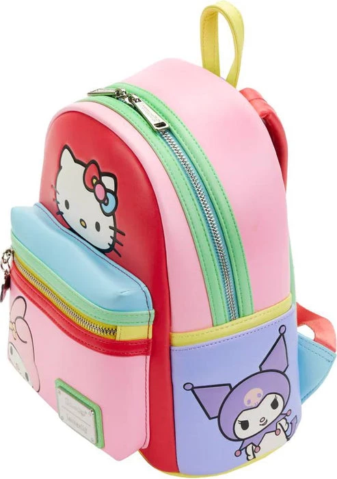 The Loungefly Hello Kitty and Friends Color Block Mini Backpack is made of vegan leather (polyurethane). Bag has adjustable shoulder straps and sturdy metal hardware. Additional features include printed and debossed details. Take note of the coordinating inside lining.