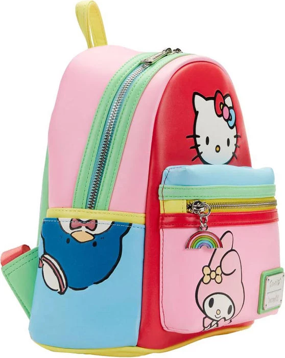 Bring your favorite characters with you wherever you go! The Loungefly Hello Kitty and Friends Color Block Mini Backpack offers a fun and stylish way to travel with your favorite Sanrio friends. On the front, My Melody greets you on the zipper pocket while Hello Kitty peers out from above. Kuromi and Tuxedosam appear on the bag’s side pockets, while Pom Pom Purin and Kero Kero Keroppi wave hello on the back. The bright color blocked panels and rainbow enamel zipper charm make this accessory a cute and cheery addition to any outfit.
