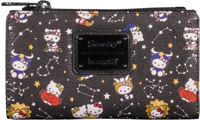 This adorable all-over print reimagines Kitty as zodiac signs, as well as constellations! All the signs are there, with Kitty accompanying them in different themed costumes. As Leo, sheβs an adorable lion. Representing Taurus, she dons a cute bull outfit. With Gemini, her twin, Mimmy, is featured by her side. Printed against black vegan-friendly leather and finished with silver-tone hardware, all signs point to this wallet being part of your accessory collection!