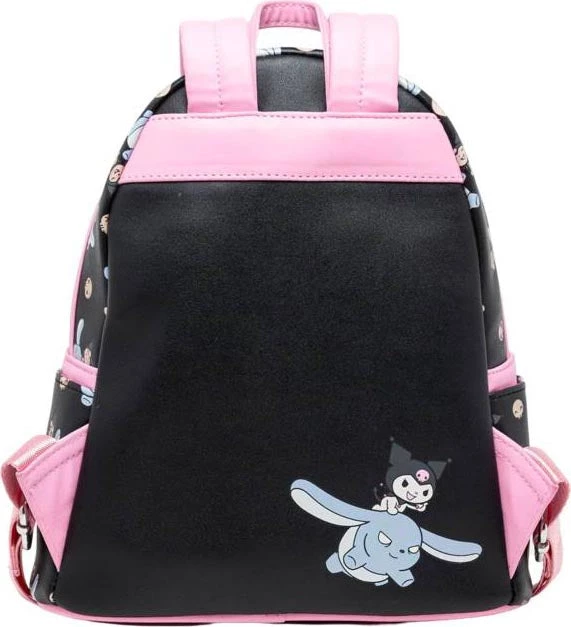The chaotic cutie and her dependable companion, Baku, are featured flying and lying about on this adorable mini backpack. Happy and angry skulls are also dotted throughout the print, standing out against black vegan-friendly leather. Kuromi and the skulls even glow in the dark!