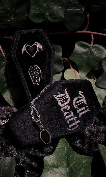 Til Death Do us part – the perfect ring box for all you gothic couples out there! Add a touch of lustΒ and loveΒ to your gothic wedding with this Velvet Ring Box.