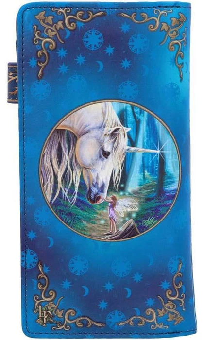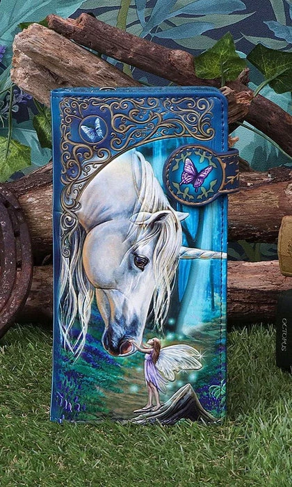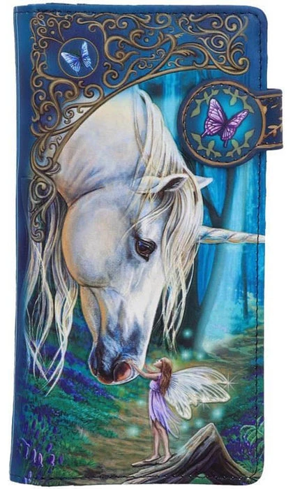 From the untamed, enchanted imagination of world-renowned artist Lisa Parker. On the surface of the forest floor, two magical creatures emerge and reach out to one another. A tiny Fairy stands atop a fallen tree branch as it reaches upwards, greeting an adult Unicorn which cranes downward, just close enough so that the Fairy can touch the Unicorn’s nose. The fairy wears a flowing lavender dress with her translucent wings reflecting the moon’s light as it filters through the treeline above. As the Unicorn leans downwards its long, untamed mane follows. Behind the mystical creatures is a lush bluebell wood during twilight, completing the magical scene. The beautiful embossed detailing enhances the magic and creates a striking 3D effect while the large compartments make it a wonderfully practical piece.