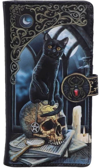 From the untamed, enchanted imagination of world-renowned artist Lisa Parker. Embodying the true spirit of Salem, this jet black witch’s familiar sits above an aged skull. The carving in the skull is a true map of Salem from the times of the harrowing Witch Trials, making this piece even more meaningful than initially perceived. Underneath the cranium is a stack of ancient newspapers, outlining the horror of the trials. Intelligently executed and full of significance, this purse is a perfect reminder of the persecution faced by our elder witches, but through their struggle, we thrive. The beautiful embossed detailing enhances the magic and creates a striking 3D effect while the large compartments make it a wonderfully practical piece.