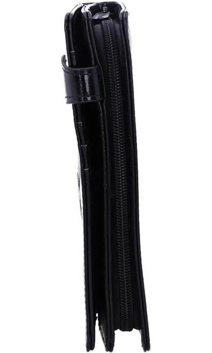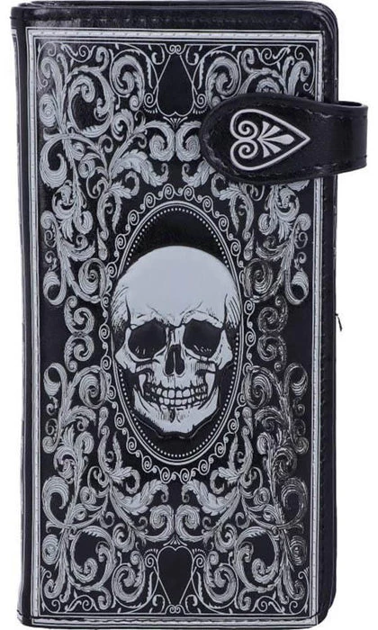 This fantastic skull Purse is a great way to keep your money safe. On a black background, a white skull sits in the centre of the Purse, facing directly at you and grinning macabrely. Itβs surrounded by baroque plumes and feathers, giving the impression of a particularly ornate playing card design. Held closed by a stud button on a black strip, and with a large zip compartment, this alternative Purse is small enough to fit in any handbag while being spacious enough to accommodate all your cards and cash.