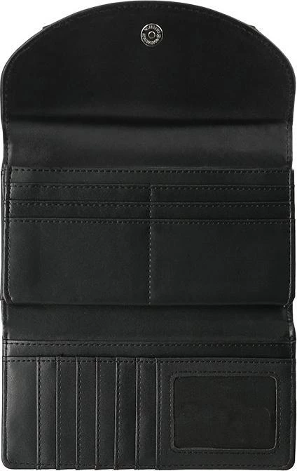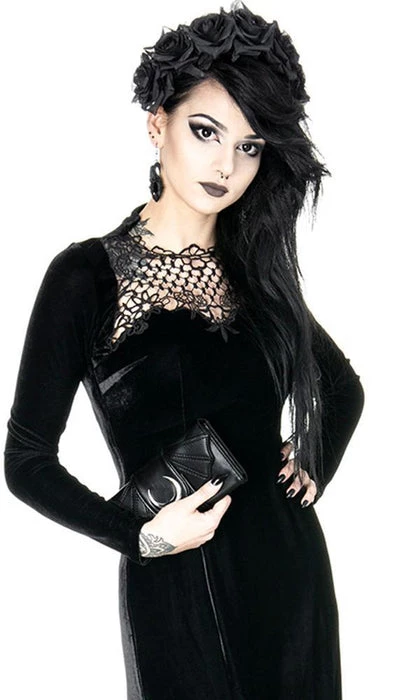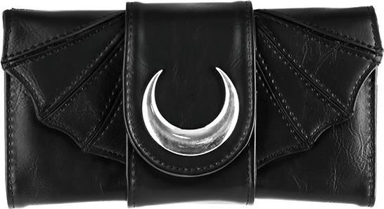 Elegant,Β long wallet with bat wingsΒ and metal moon statement hardware adorning the front. Made of solid and firm, faux leather with strong texture, this bad girl opens and is fastened with a snap button.Β Main three compartments are on the inside for bank notes, and one zipped for coins.Β Also many compartments for business cards. Perfect for every gothic girl who loves cute things.