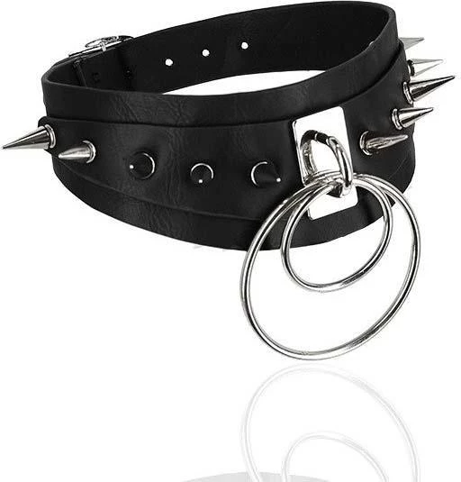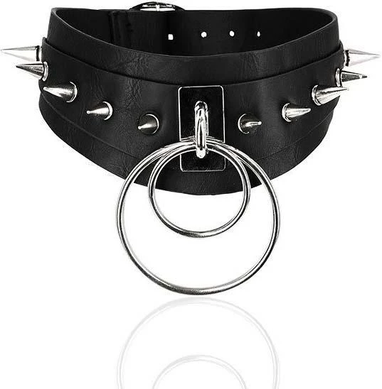 Add definition to refined edits with this Double Spiked choker.Β It’sΒ crafted from textured black Pu leather (100% vegan).Β The structural piece is punctuated by a metal spikes and Double Ring statement piece. It has a silver metalΒ buckle on the back.Β Let the classic gothic design be your go-to choice for refined finishes.