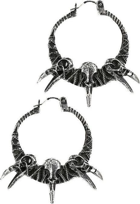 The Raven skulls earrings pay homage to women that carry themselves with passion and strength. The pagan earrings been crafted from antique-plated zinc, and features circular hoops with suspended cord carving and crow skulls for an artful touch. Style yours with matching necklace!