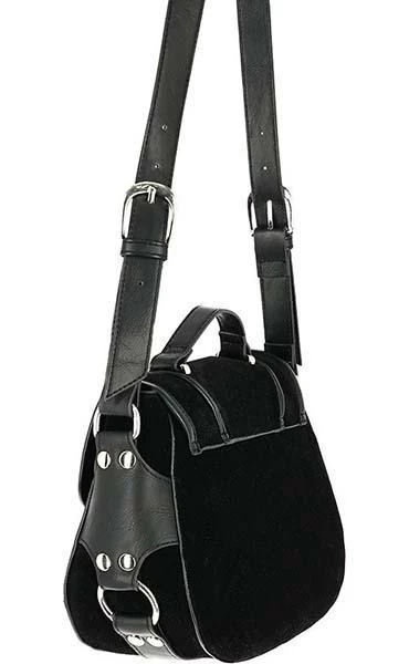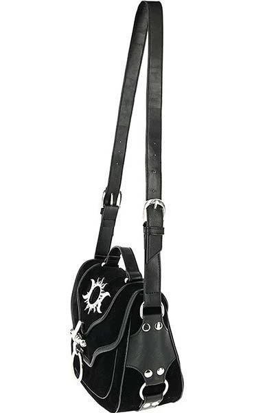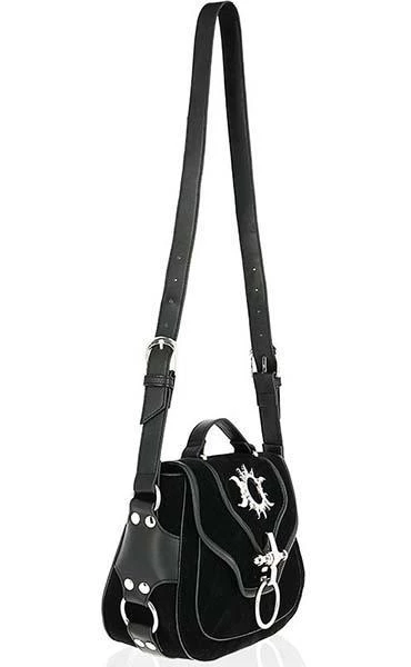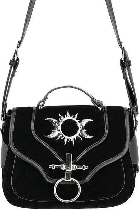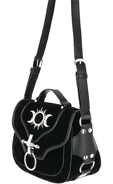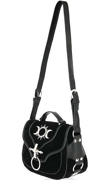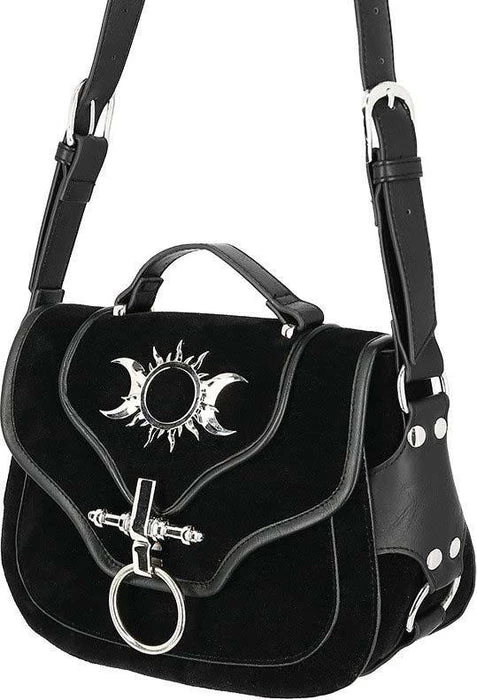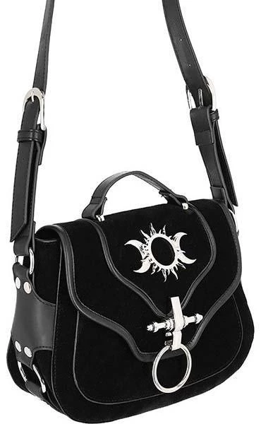 ThisΒ deep blackΒ Triple Goddess bag fromΒ Restyle is an everyday option withΒ a gothic charm.Β Cut fromΒ faux suede withΒ structured flap-top style trimmed with the PU.Β Itβs embellished with an O-ring decoration and a Moon and Sun Unique Alloy Ornament.Β The flap closure opens to reveal quite roomy compartment with two pockets,Β handy for storing your keys or phone.Β This gothic shopper bag balances elegant charm with rebellious attitude!